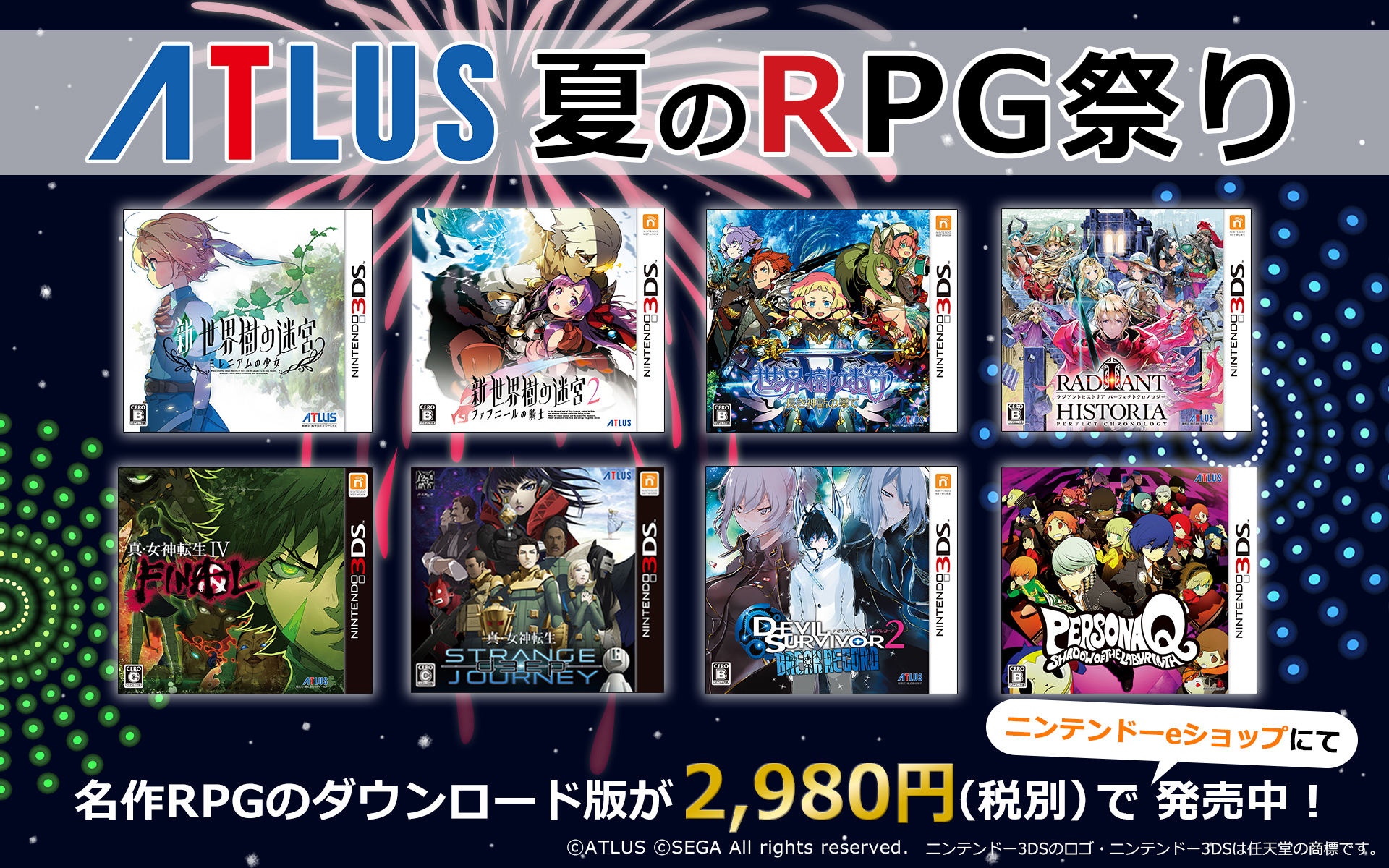 「アトラス夏のRPG祭り」として、3DSのRPG8タイトルのDL版をプライスダウン致しました。