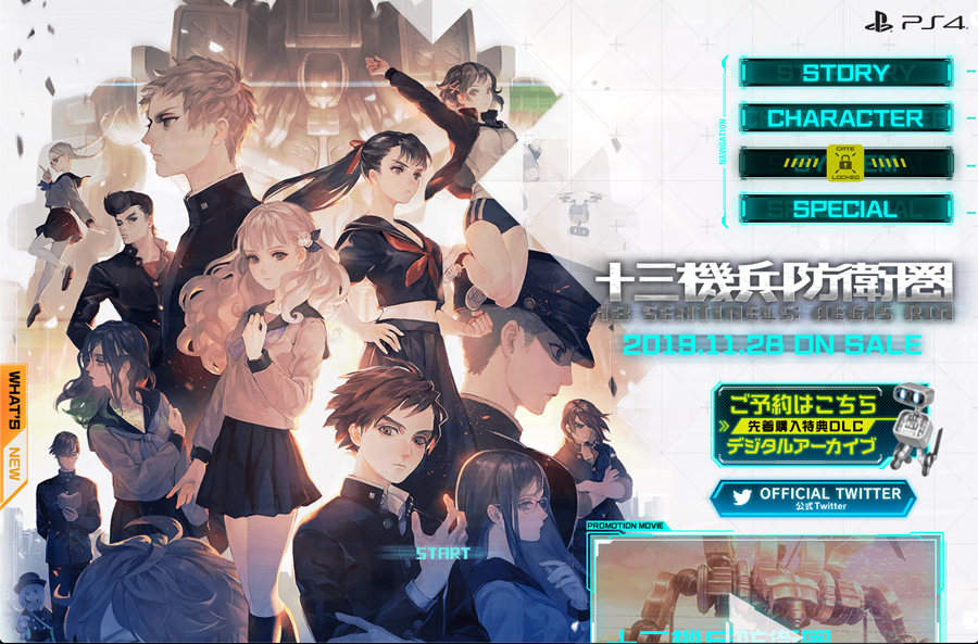 2019.08.08 『十三機兵防衛圏』公式サイトグランドオープン! #ゲーム情報 #十三機兵防衛圏 SHARE みなさんこんにちは、アトラス広報です。 本日、PlayStation®4用ソフト『十三機兵防衛圏』公式サイトをグランドオープンしました! 新たに3つのコンテンツを公開! STORY ゲームのプロローグシーンを紹介!今後情報を追加予定ですので、ご期待下さい。 CHARACTER 物語の主人公となる十三人を美麗なアニメーションと共に紹介! SPECIAL 各種ムービーなどのコンテンツを随時掲載してまいります。 今後も『十三機兵防衛圏』をよろしくお願いいたします。 十三機兵防衛圏 ジャンルドラマチックアドベンチャー 発売日2019年11月28日 PS4 公式サイト ニュース一覧