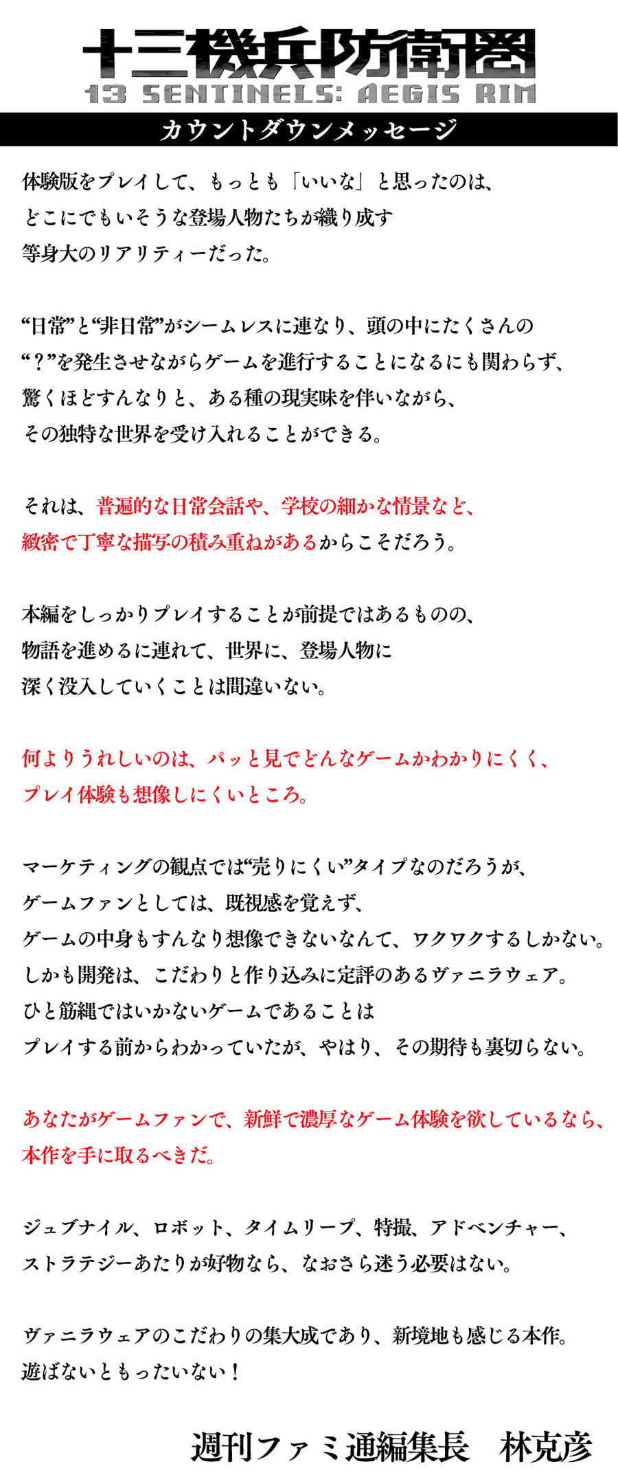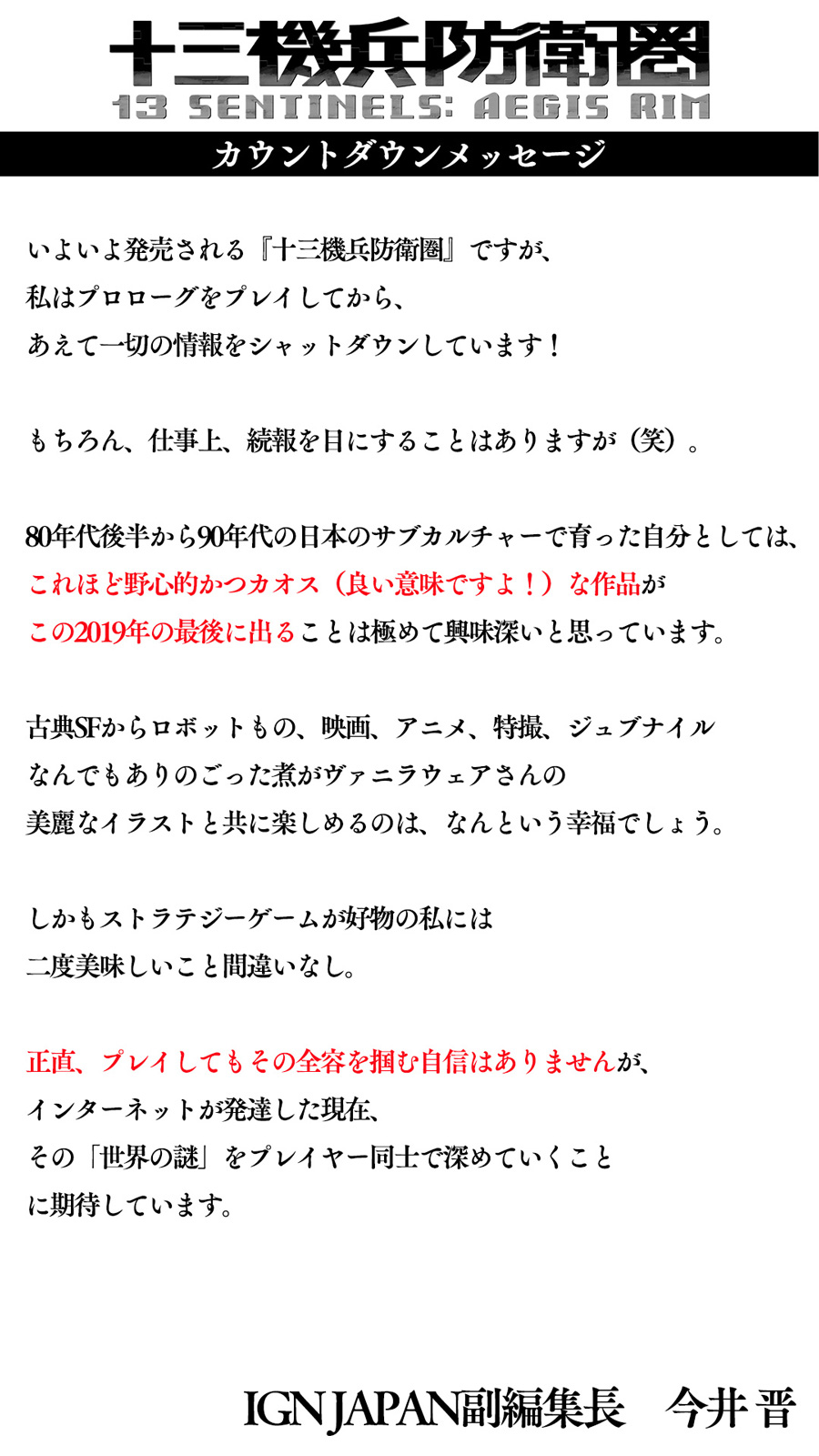 そこで、著名人の方々による『十三機兵防衛圏』への応援・期待のメッセージを頂きましたのでご紹介いたします!