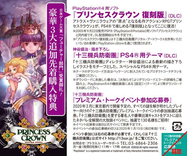 11月28日発売のPS4『十三機兵防衛圏』に関しまして、4大先着購入特典の一つである「プレミアム・トークイベント応募券」が印刷された「シールまたはチラシ」が、まれに貼付または同梱されていない商品があることが判明いたしました。