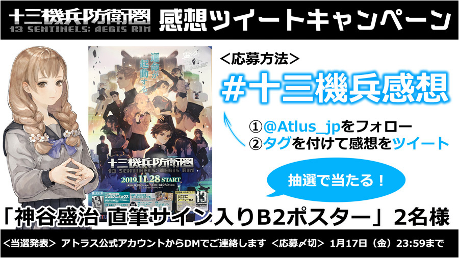 当選者の方にはアトラス公式アカウント(@Atlus_jp)から当選者のTwitterアカウントへダイレクトメッセージでご連絡いたします。