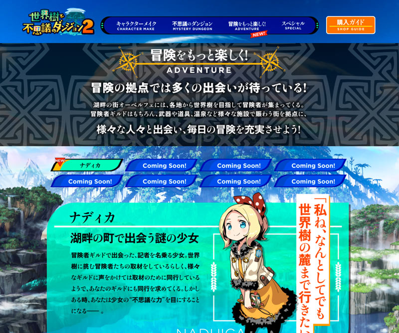 「冒険をもっと楽しく!」ページがオープン。今作のキーとなる少女「ナディカ」の情報を公開いたしました。その他、今作の冒険を盛り上げる施設や人々を、今後も掲載してまいります。