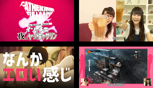 この動画は、仲の良い声優・磯村知美さんと松浦チエさんがオンライン飲みしながら『キャサリン・フルボディ for Nintendo Switch』の体験版をプレイするという、ややユルめの企画です。