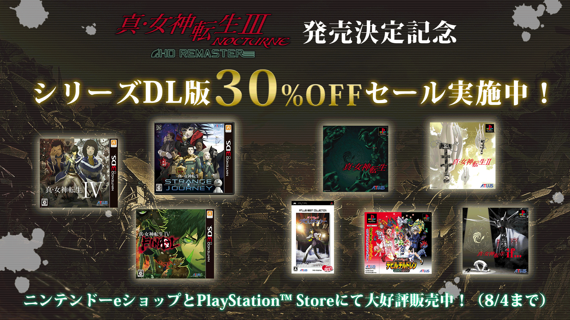 PS Storeとニンテンドーeショップ ※価格は税込にて、『真・女神転生』シリーズ過去作のセールを実施中です!8月4日(火)までの期間限定で、下記のタイトルが全て30%OFFでお買い求めいただけるチャンスとなっております。未プレイタイトルがある方はぜひチェックしてみてください!