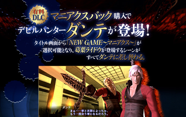 タイトル画面から「NEW GAME -マニアクス-」 が選択可能となり、葛葉ライドウが登場するシーンがすべてダンテに変更されます。