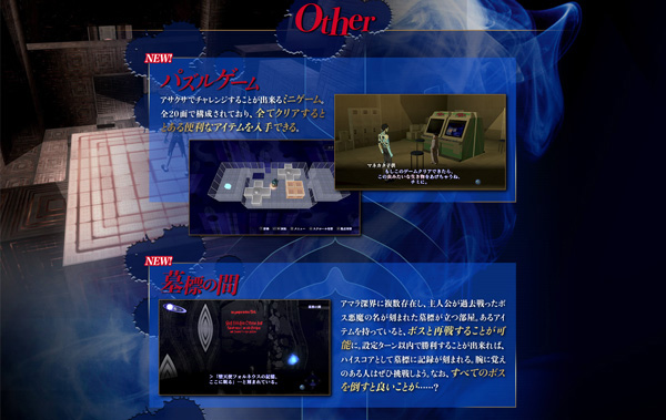ボルテクス界のひと時のオアシス?「パズルゲーム」や過去に主人公が戦ったことのあるボスと再び戦う事ができる「墓標の間」、その他「周回プレイ」や「中断セーブ」を紹介。