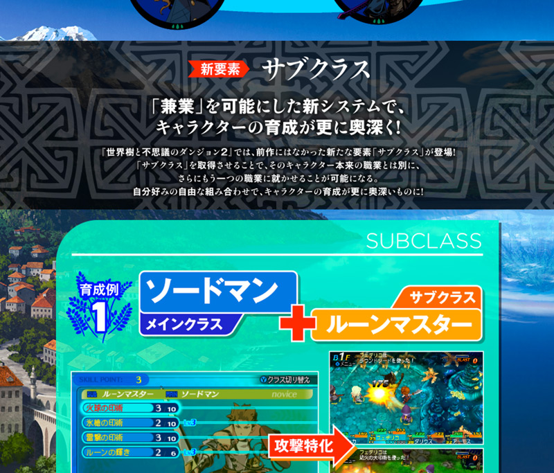 本日『世界樹と不思議のダンジョン2』公式サイト内、「キャラクターメイク」のページに「サブクラス」の情報を追加いたしました。サブクラスの登場で、パーティ編成がより奥深いものになります。
