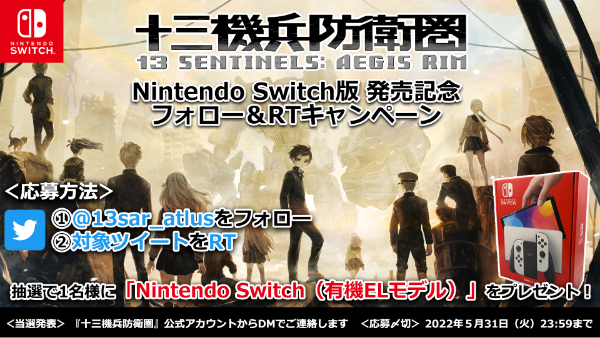 『十三機兵防衛圏』Nintendo Switch版の発売を記念して、公式twitterアカウント(@13sar_atlus)で「Nintendo Switch(有機ELモデル)」が当たるフォロー&RTキャンペーンを実施中!ぜひご参加ください。
