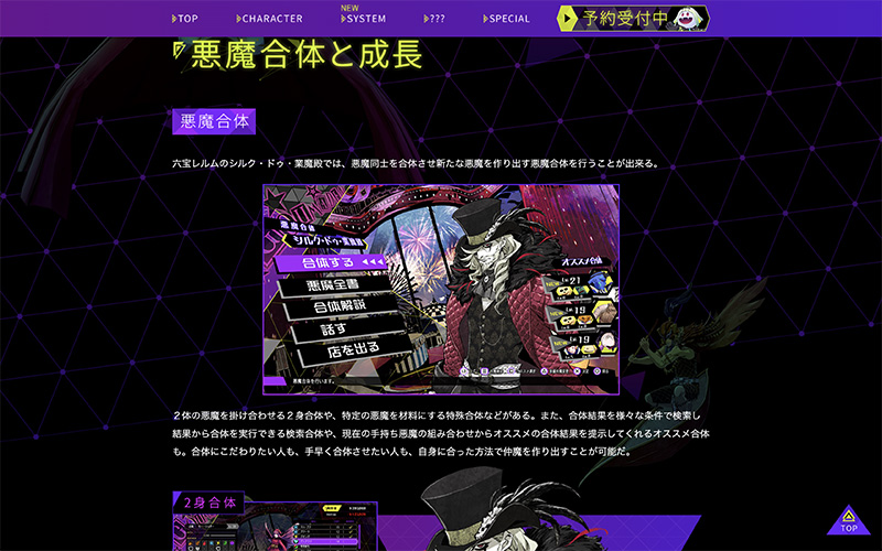 今回公開した「システム」ページでは、悪魔合体ができる「シルク・ドゥ・業魔殿」や仲魔の成長によってもらえる「ギフト」などを紹介しています。