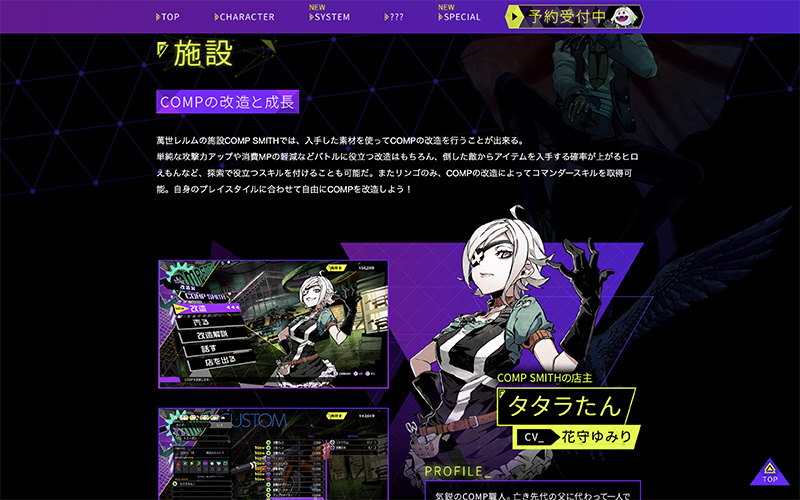 今回公開した「システム」ページでは、COMPの改造やアクセサリーの購入、仲間との交流ができる店舗などを紹介しています。