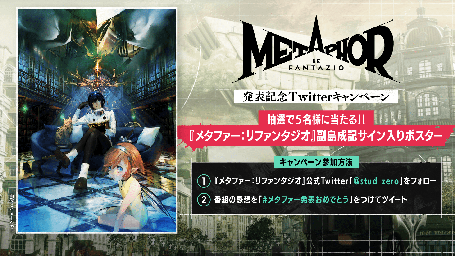 『メタファー:リファンタジオ』の発表を記念して、公式Twitter(@stud_zero)にてツイートキャンペーンを開催中です。