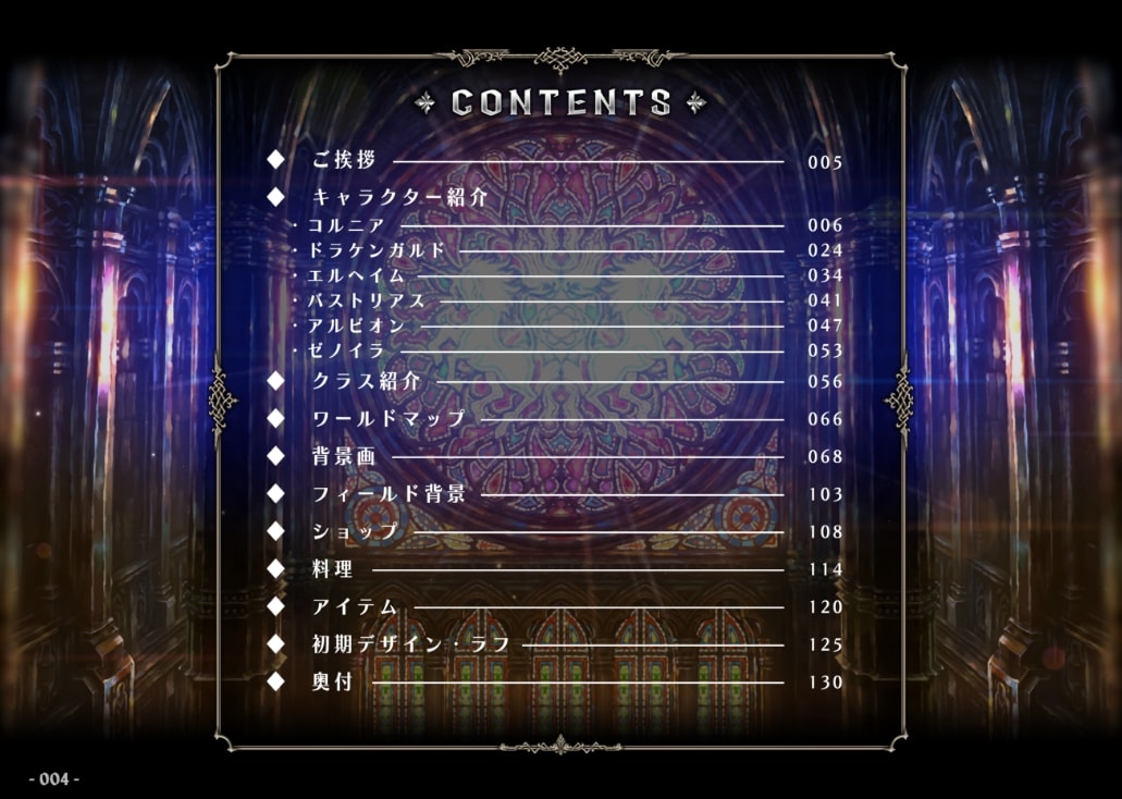 「キャラクターイラスト」「美術設定」「初期デザイン/ラフ」などを収録した
