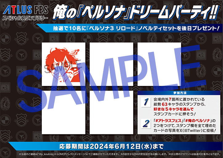 5つのスタンプ欄をすべて埋めたら、スタンプカードを撮影した写真を「#アトラスフェス」「#俺のペルソナ」の2つをつけてX(旧Twitter)に投稿してください!投稿してくださった方から抽選で10名に、『ペルソナ』シリーズ最新作『ペルソナ3 リロード』ノベルティセットをプレゼントさせていただきます。アトラスフェスの感想やパーティ編成のこだわりポイントもぜひ添えてくださいね。