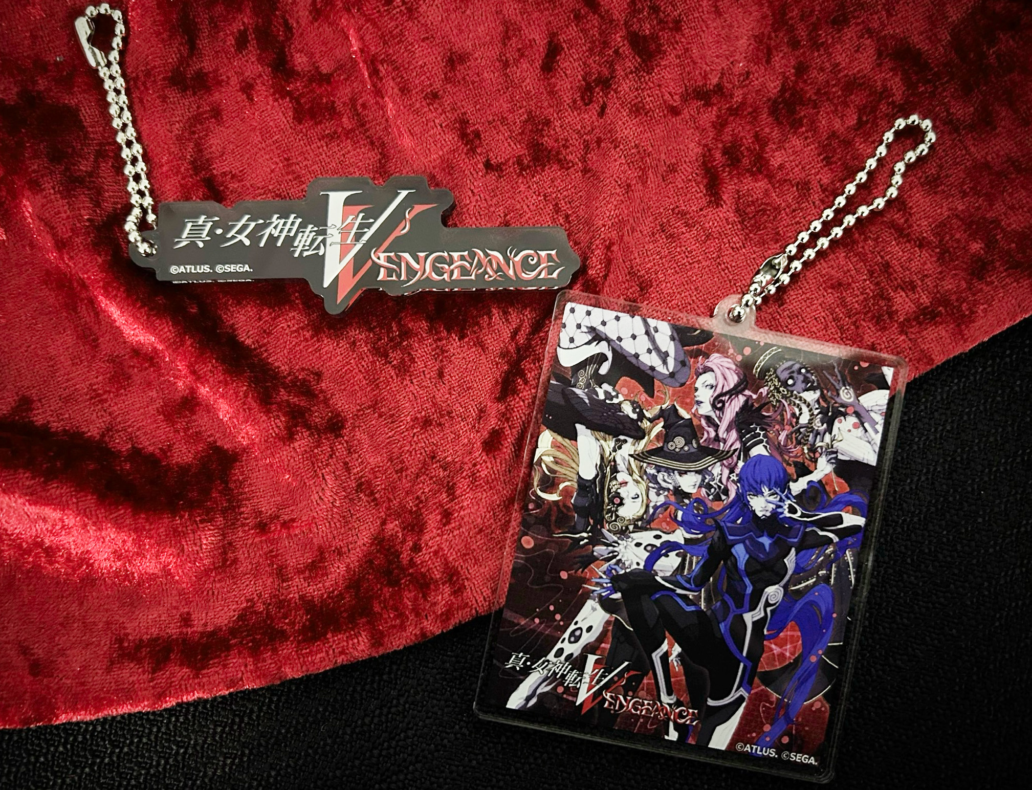 『真・女神転生Ⅴ Vengeance』のロゴ/キービジュアルのアクリルキーホルダー。