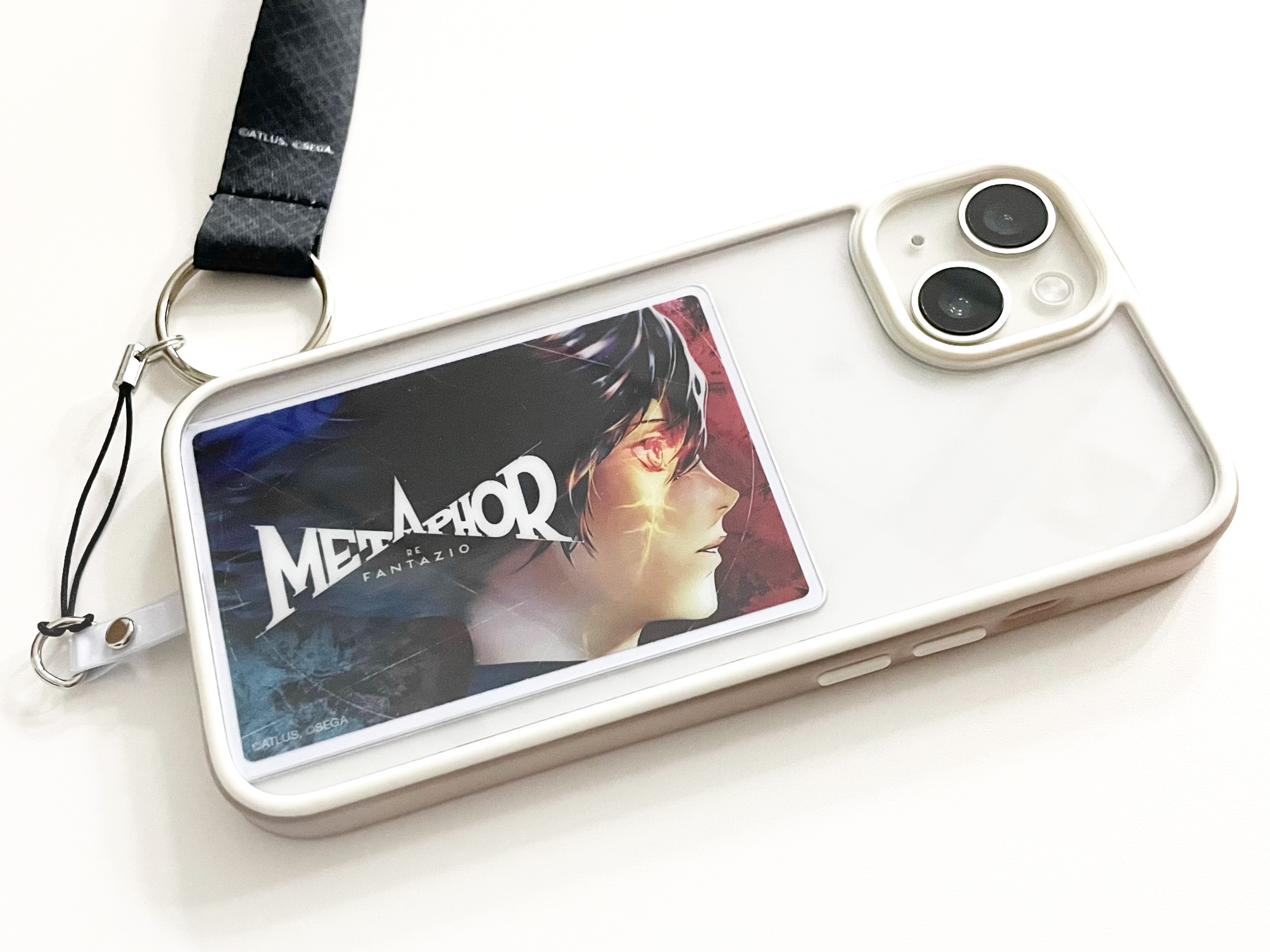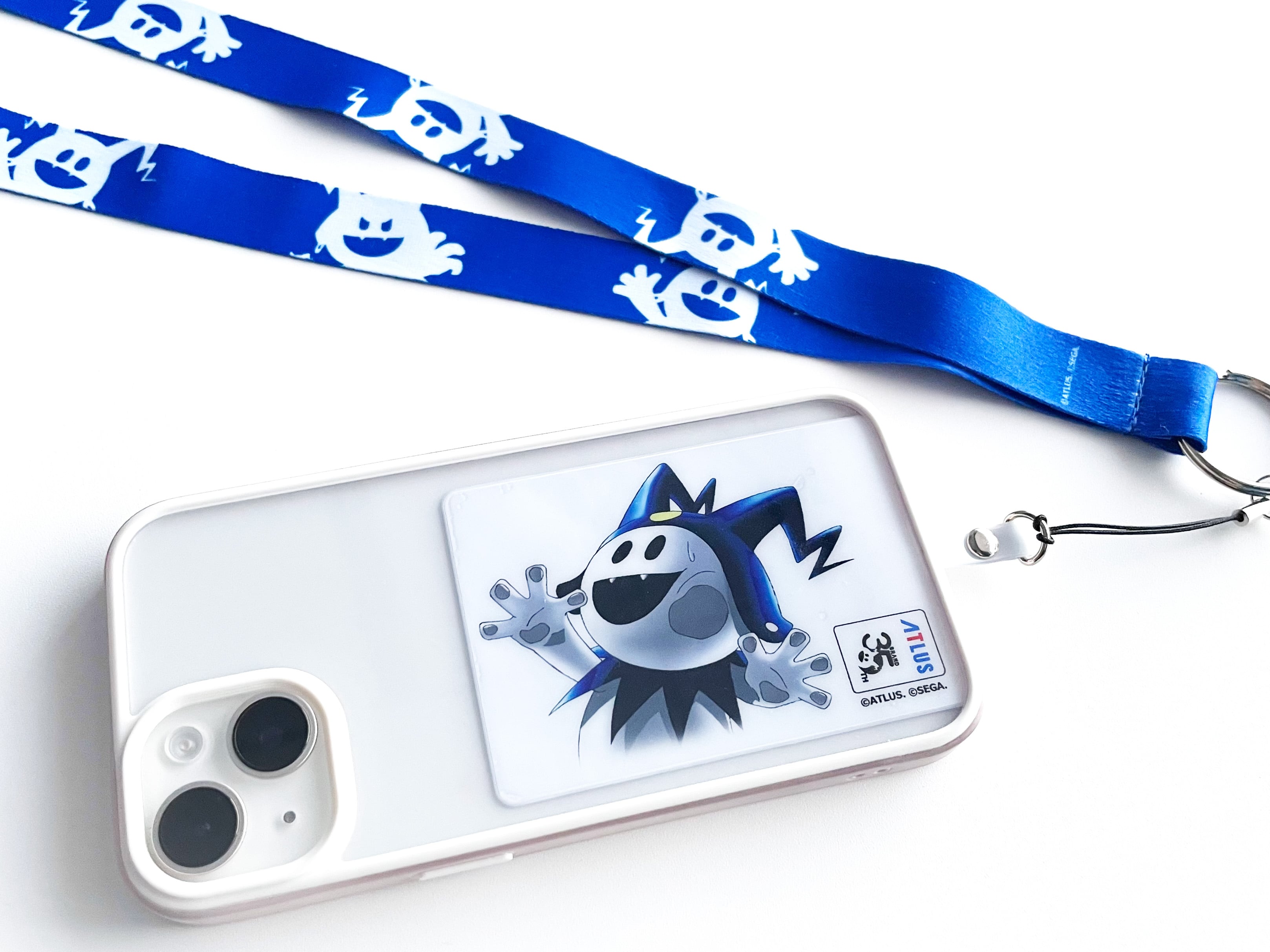 主人公の横顔があしらわれたフォンタブ&ネックストラップ。