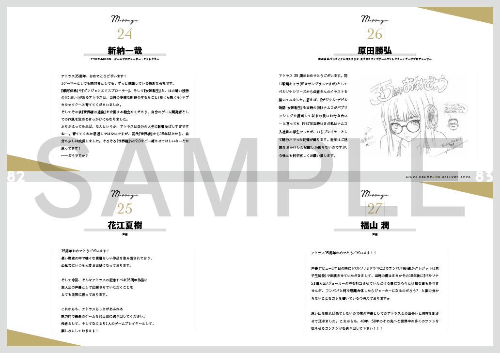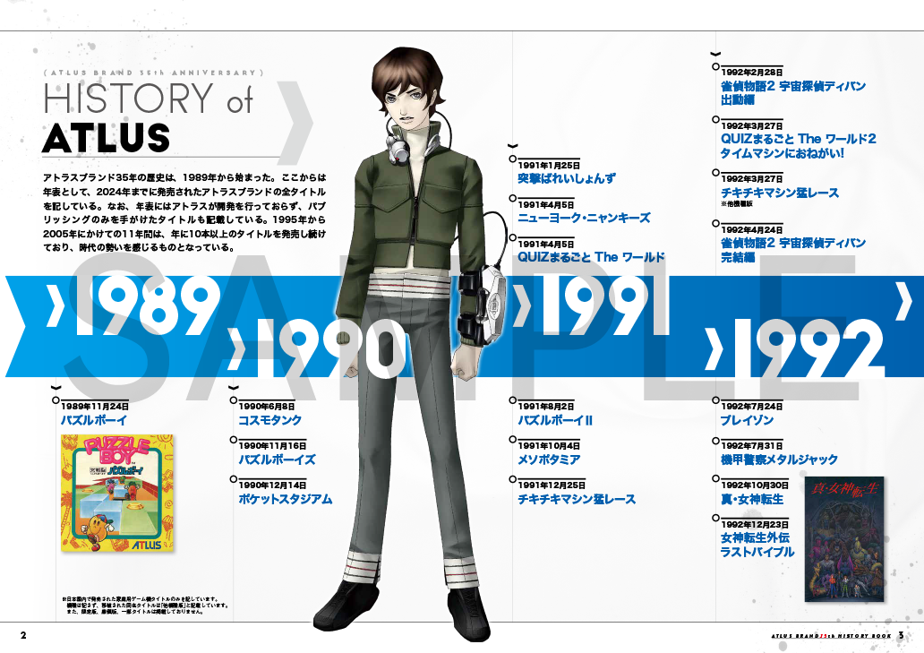 「アトラス」ブランドが初めてゲームソフトを出してからこれまでのタイトル年表や、主要タイトルの紹介、そして「RPGの面白さとはなにか」についてドラゴンクエストシリーズの堀井雄二氏との対談が掲載。さらに、様々なクリエイターや著名人からのコメントやイラストも収録。豪華な一冊となっています。