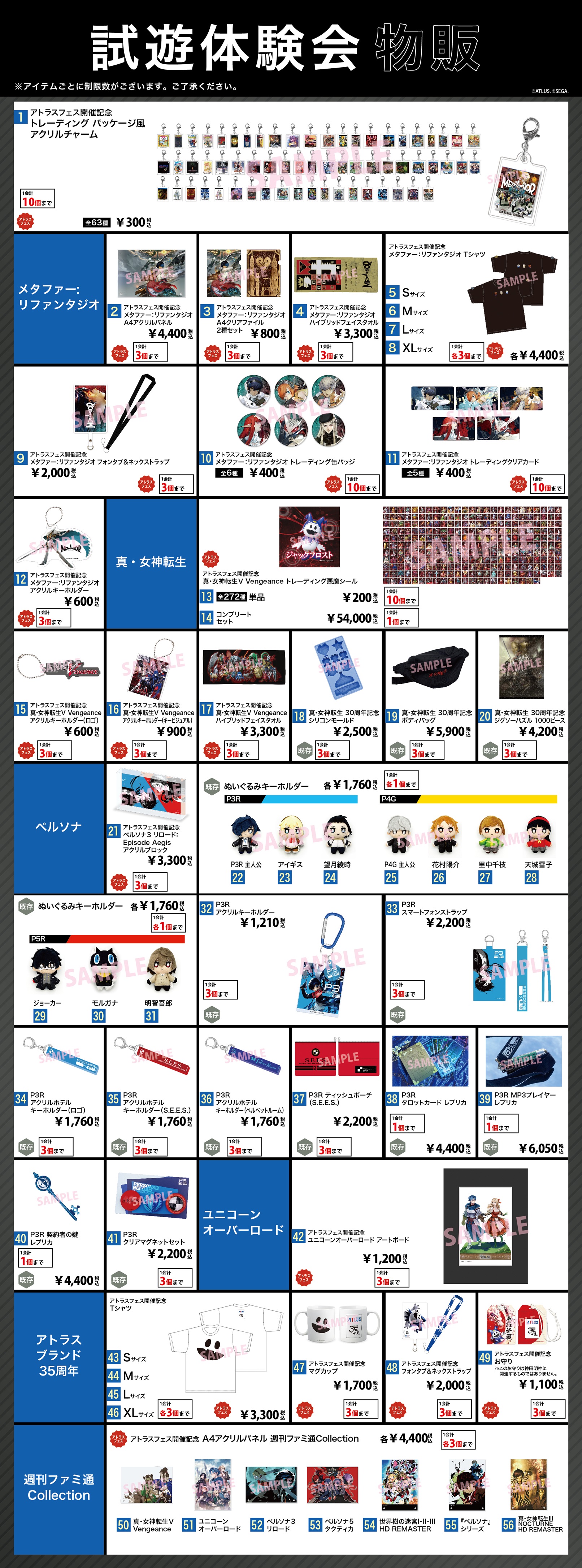 アトラスフェスで先行販売を行った『メタファー:リファンタジオ』『真・女神転生Ⅴ Vengeance』『ペルソナ3 リロード: Episode Aegis』グッズ、および『アトラスブランド35周年』グッズなどのアトラスフェス開催記念グッズをはじめ、大人気の『ペルソナ』シリーズぬいぐるみキーホルダーなど選りすぐりのアイテムをご用意。さらにアトラスフェスにてカプセルトイコーナーで販売した大人気商品「トレーディング パッケージ風アクリルチャーム」も購入できます!ぜひお買い求めください!