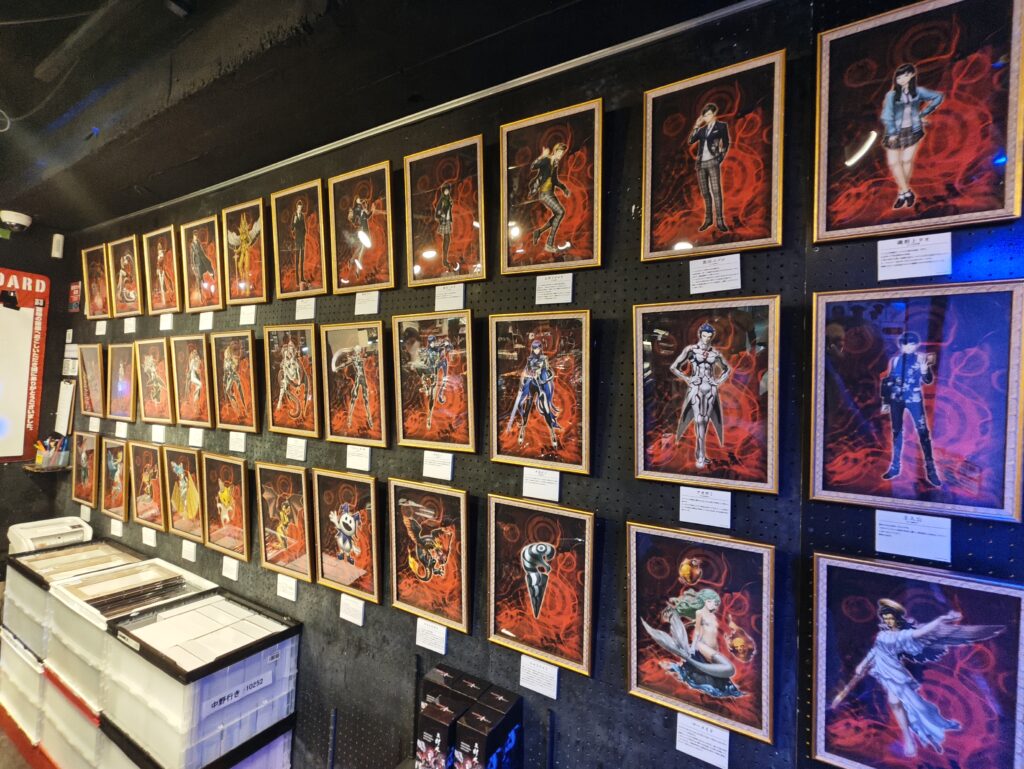 店頭にはソピアーのスタンディと一緒に写真が撮れる「邪教の世界」フォトスポットや、土居政之デザインの『真VV』悪魔やキャラクターたちの額装展示が所狭しと並びます!