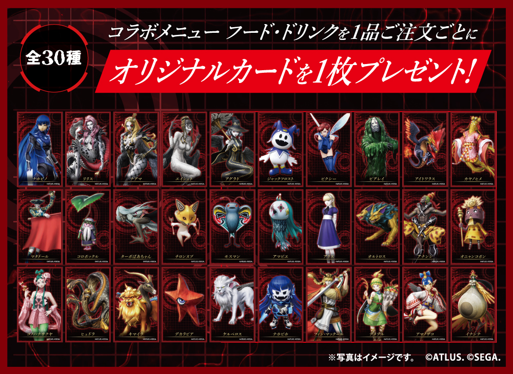 コラボメニューを1品ご注文ごとにゲーム内登場キャラクターのオリジナルカード(全30種)を1枚プレゼント!