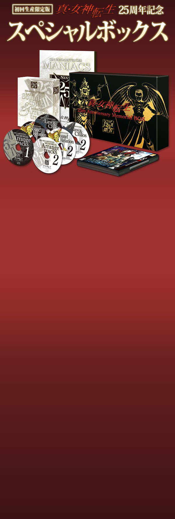 - レアアイテムを同梱する、25周年にふさわしい豪華装丁のBOX。表面はシリーズの原点を象徴するLAW・CHAOSそれぞれの悪魔を金箔であしらい、裏面には歴代タイトルのジャケットイラストが集合!