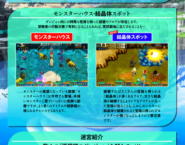 『世界樹と不思議のダンジョン2』公式サイト内、「不思議のダンジョン」のページに、ダンジョン内の特殊なフロア「モンスターハウス・結晶体スポット」を追加いたしました。
