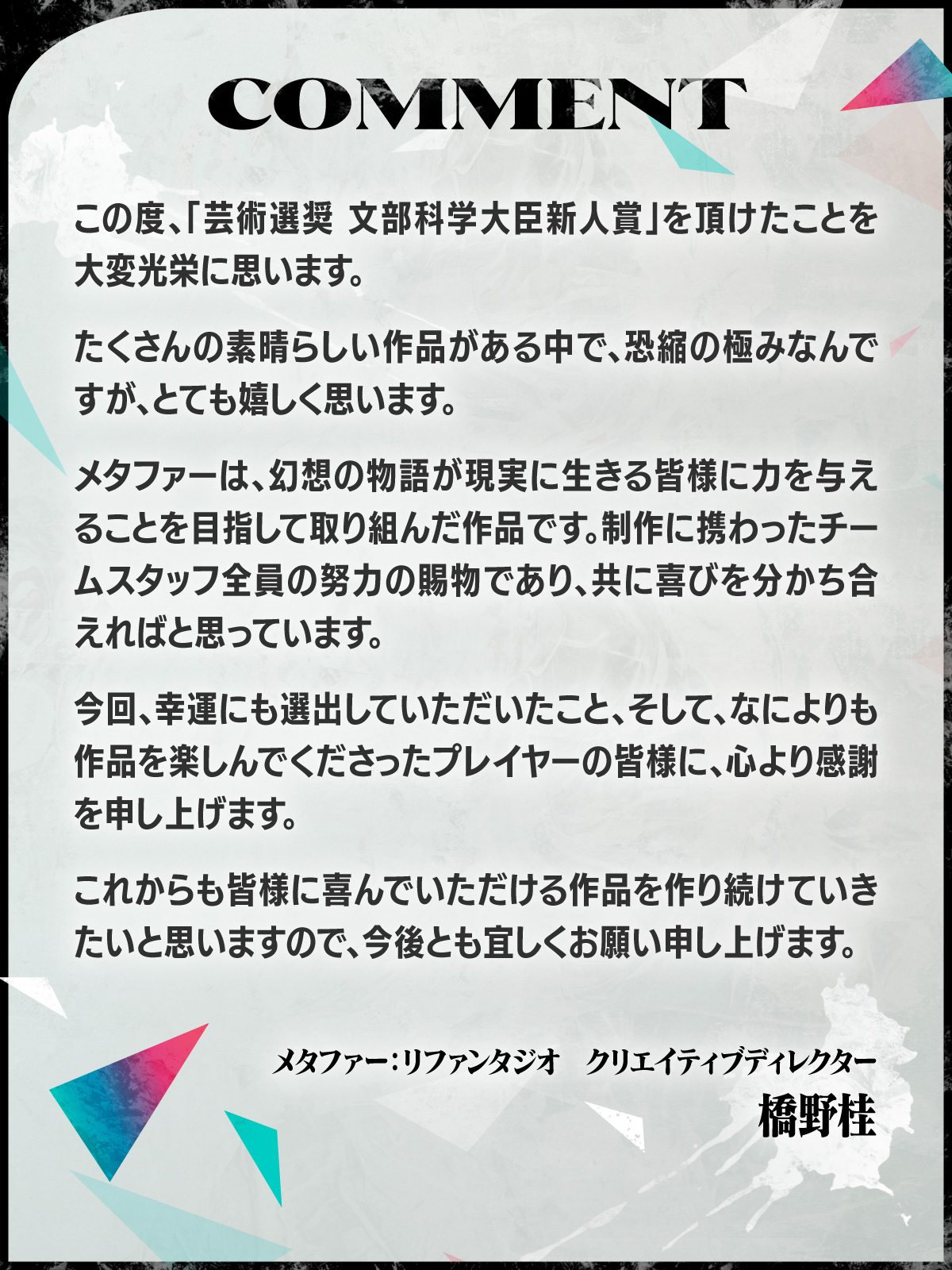 このたび、『メタファー:リファンタジオ』の成果を評価いただき、『文化庁 令和6年度(第75回)芸術選奨メディア芸術部門 文部科学大臣新人賞』をアトラスのクリエイティブディレクター橋野桂が受賞いたしました。