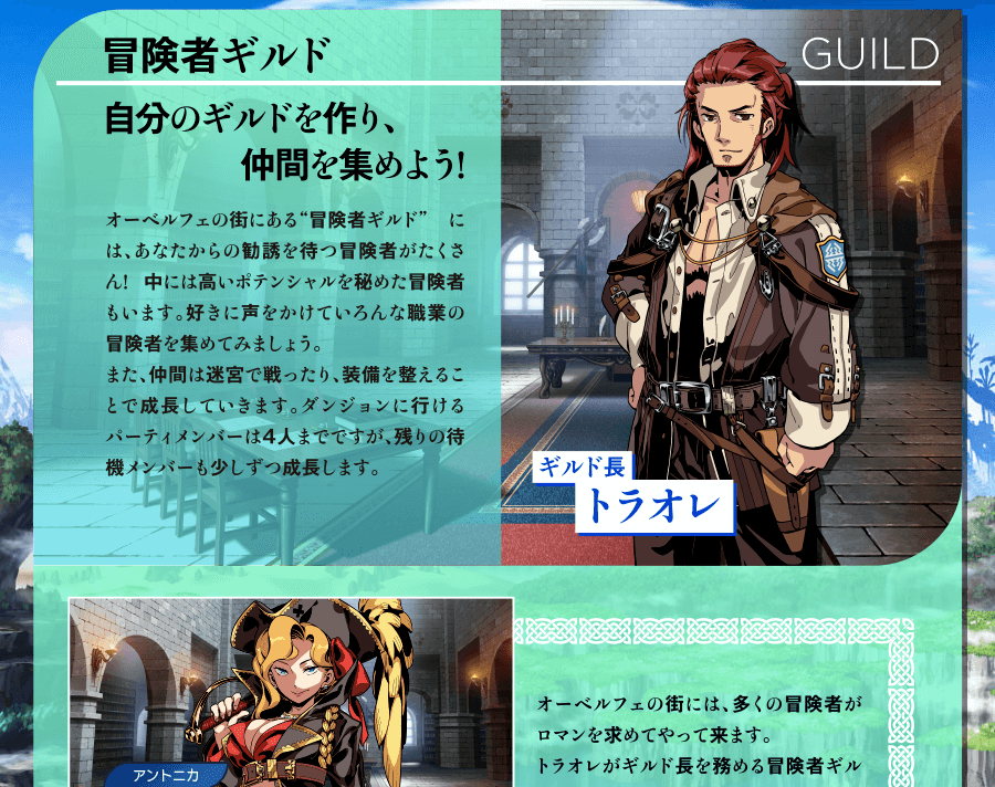 冒険者ギルドでは冒険者の登録、パーティの編成などが行なえます。パーティメンバーに入らなかった待機メンバーも、迷宮探索中に少しずつ成長するので、たまに様子を見に来るのもいいかもしれません。