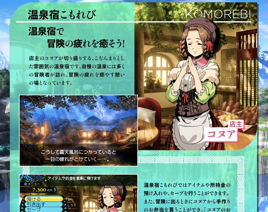『世界樹と不思議のダンジョン2』公式サイト内、「冒険をもっと楽しく!」ページの「冒険者ギルド」を更新いたしました。さらに街の施設「温泉宿こもれび」を追加いたしました。