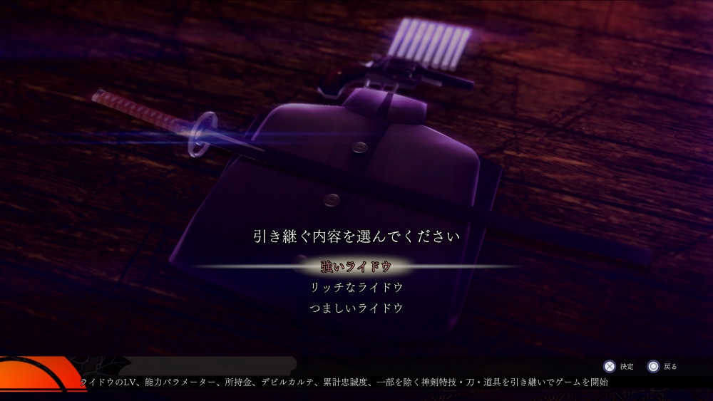 選択すると、クリア時のライドウのレベル/能力パラメーター/所持金/デビルカルテ/累計忠誠度/一部を除いた神剣特技と刀、道具を引き継いでプレイが可能になります。