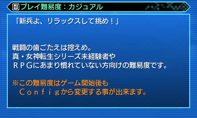 今回始めて真・女神転生を遊ぶ方や、前作を難しくて途中断念してしまった方はカジュアル(簡単)を選んでいただければと思います。