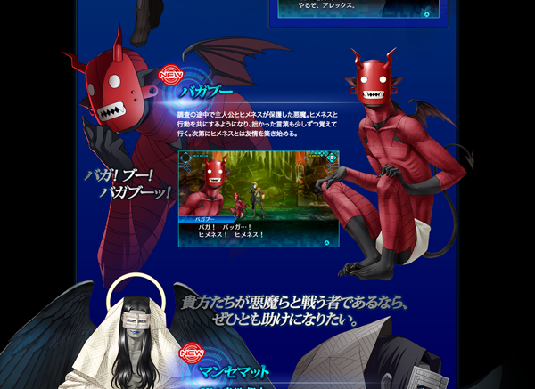2017.08.10 STORY&CHARACTERページに「バガブー」「マンセマット」の紹介を追加! #ゲーム情報 #真・女神転生 DEEP STRANGE JOURNEY SHARE 『真・女神転生 DEEP STRANGE JOURNEY』公式サイトを更新いたしました。 STORY&CHARACTERのページに、シュバルツバース内を探索中に出会う「バガブー」「マンセマット」の紹介を追加いたしました。こちらのページでは全身イラストを見ることができます。 また、購入ガイドにて「いまじん」と「ステラワース」の店舗特典が公開されました。 「いまじん/いまじんWEBショップ」大型 布ポスター 「ステラワース」ブロマイドセット 引き続きメガテン公式Twitterでは毎日悪魔を紹介中! 悪魔を一覧にまとめたDEVILページも公開中です!本作に登場する多種多様な悪魔をご覧ください! 『真・女神転生 DEEP STRANGE JOURNEY』及び『真・女神転生』シリーズを今後ともよろしくお願いいたします。 真・女神転生 DEEP STRANGE JOURNEY ジャンルRPG 発売日2017年10月26日 3DS 公式サイト ニュース一覧