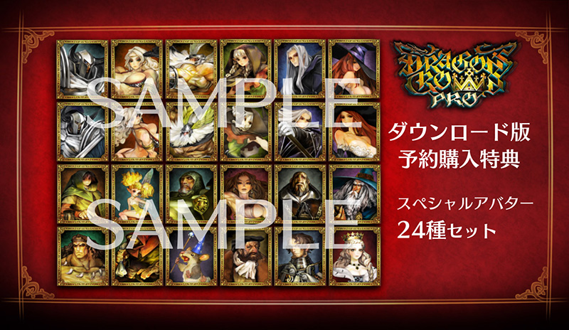 PlayStation Storeでのダウンロード版ご予約購入特典は「ドラゴンズクラウン・プロ スペシャルアバター 24種セット」となっております。ドラゴンズクラウンの世界で生きる個性豊かなキャラクターたちの中から厳選した全18キャラ、24種類をセットにしたスペシャルアバターをお届けいたします。